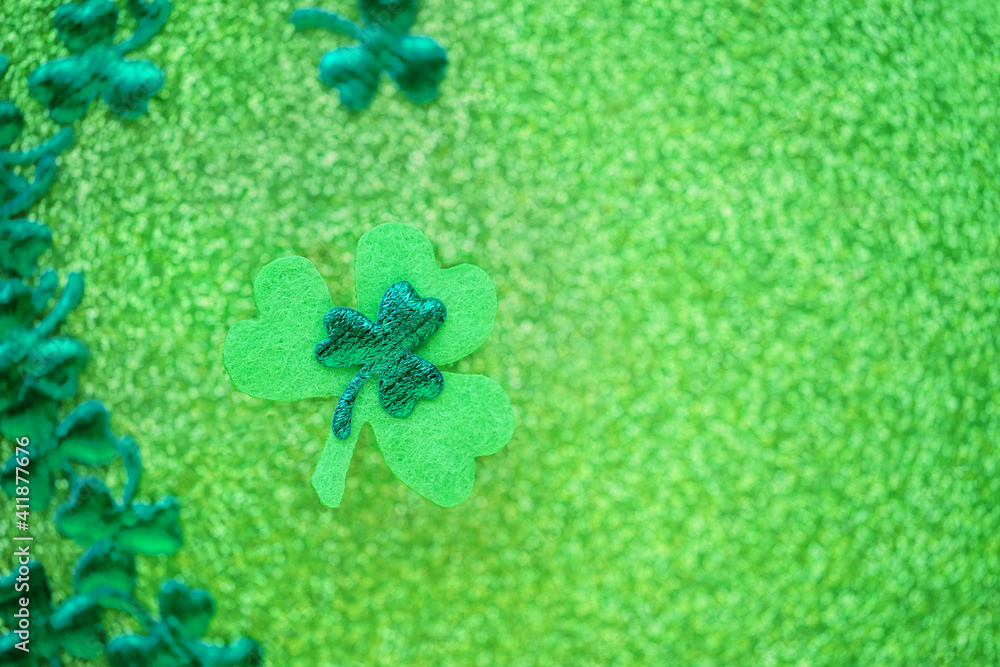 St. Patrick holiday concept. Shamrock confetti on glittering texture backdrop. shiny green decorative clovers.