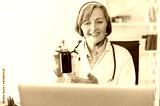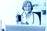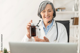 A senior old female doctor or a pharmacist with a headset in a lab coat sitting in front of a laptop, showing a bottle of prescribed medicine from cough to her patient, consulting online from home