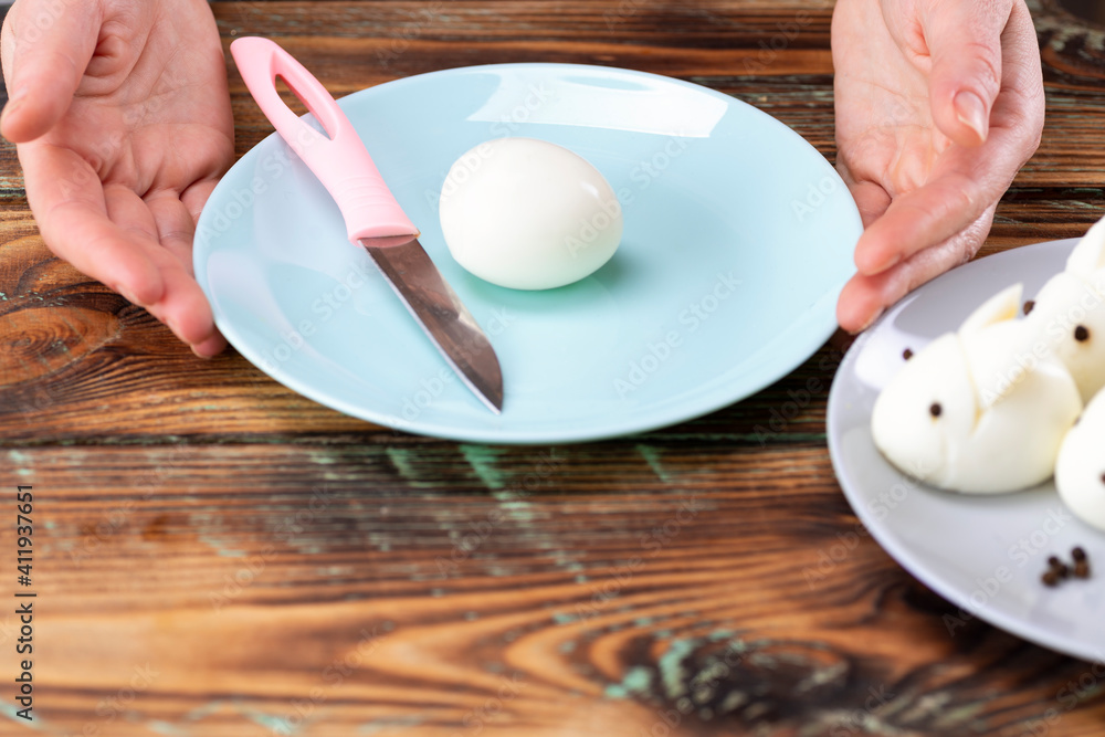 DIY instruction. Step by step guide. Making a funny rabbit from boiled eggs, decorating the Easter table, Easter decor and serving