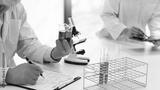 Attractive young scientist team in lab coat and safety goggles working with analysing test trial or investigations with test tubes in laboratory.