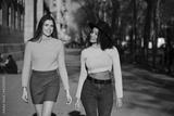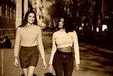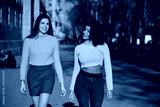 Two friends spending time together while walking outdoors on the street. Urban concept.