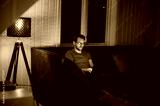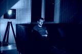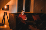 Portrait of attractive nerdy man is working late night on the computer in living room in home office