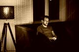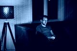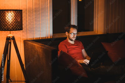 Portrait of attractive nerdy man is working late night on the computer in living room in home office