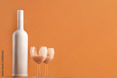 coffee liqueur. A white milk-colored bottle and two glasses with a coffee cocktail, copy space