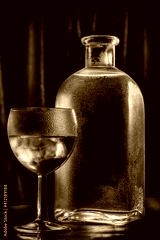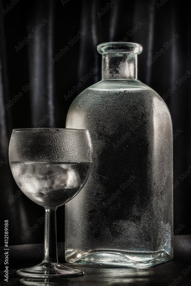 a glass of cold vodka or alcohol on the background of a beautiful bottle with drops. dark minimalistic still life