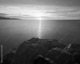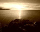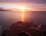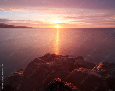 Beautiful sunrise on the sea with rocks in the foreground. Views from Torre del Mar beach.