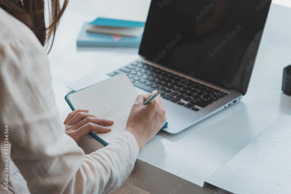 Close-up image of a businesswoman taking notes and a laptop blank on the desk.