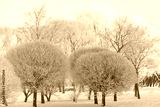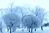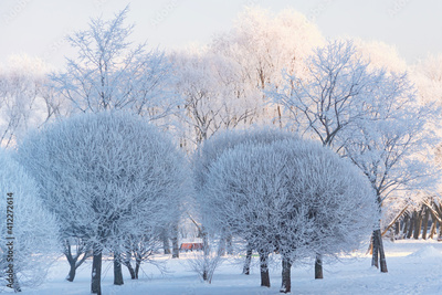 Trees covered in hoarfrost in a city park after a night cold fog.