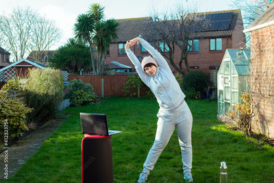 Woman doing sport workout outdoors in her garden, backyard with online tutorial or trainer. Healthy lifestyle during a lockdown. Exercising at home. Doing fitness online. Selective focus, copy space