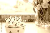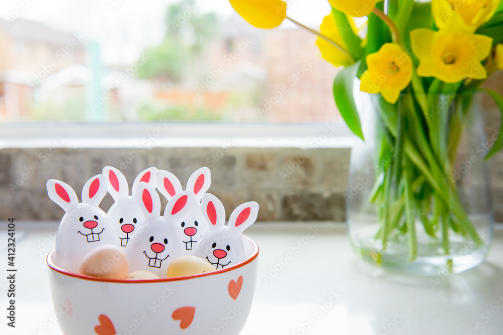Funny Easter eggs containers with bunny ears in bowl and bouquet of yellow tulips and daffodils flower on the white kitchen table near window. Festive spring composition. Selective focus, copy space