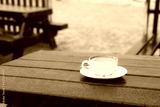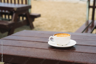 White empty coffee cup with traces of coffee on the wooden rustic table on the outdoor restaurant terrace. No visitors, closed caffe because of lockdown. Selective focus, copy space.