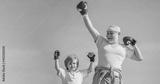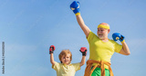 Little boy sportsman at boxing training with coach. Sports man coaching boxing little boy in red boxing gloves. Little boy doing boxing exercise with grandfather