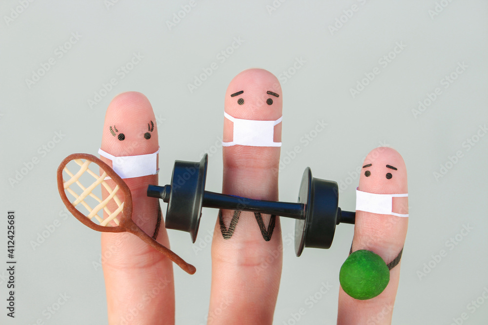 Fingers art of happy people in medical mask from COVID-2019. Concept of family in sports.