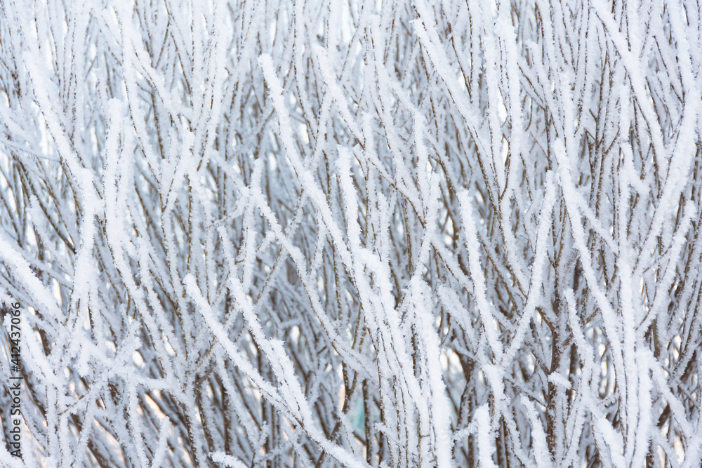 Many branches covered with ice and frost after heavy night fog, close-up view.