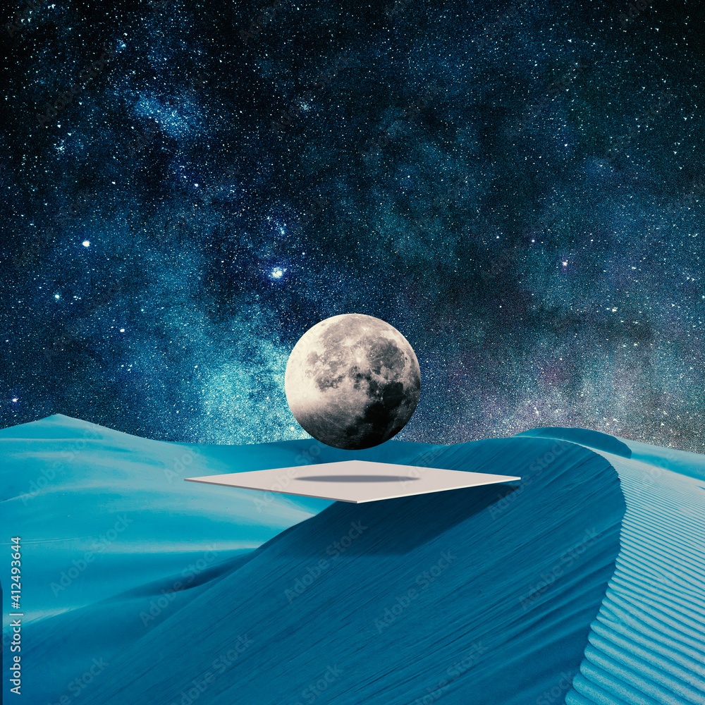 Planet levitating above the blue mountains. Collage with cosmos and astronomy theme. Negative space to insert your text. Modern design. Contemporary colorful and conceptual bright art collage.