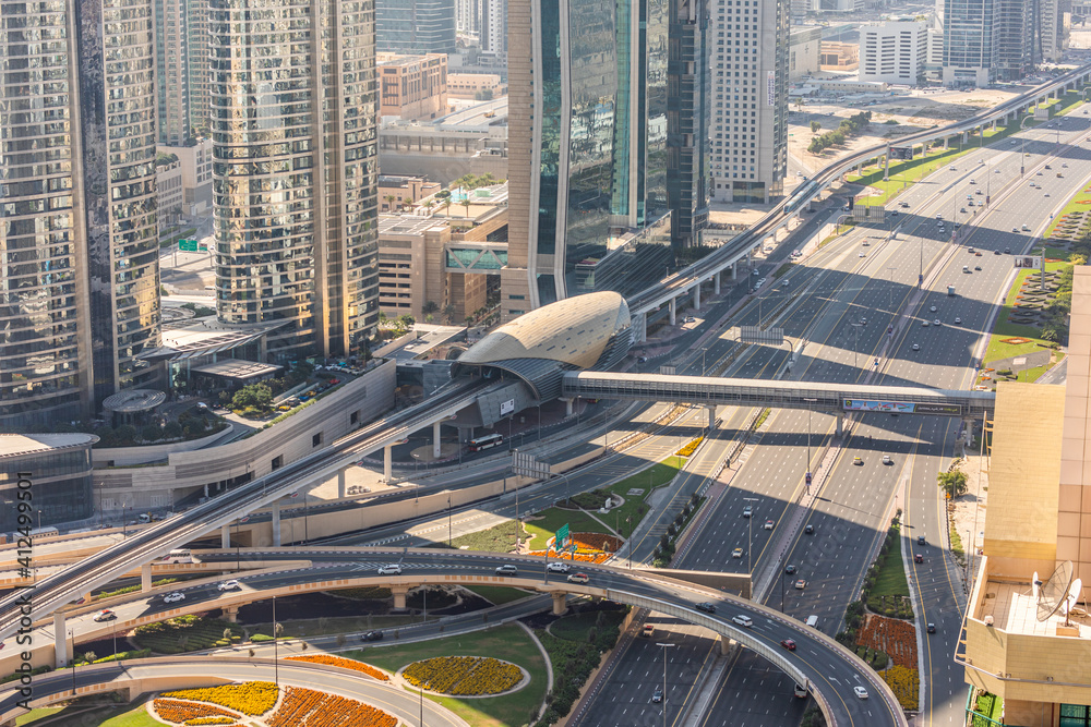DUBAI, UAE - December, 2020: Dubai skyline with beautiful city close to it's busiest highway on traffic