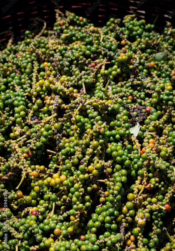pods of freshly picked organic kampot green peppercorns in cambodia