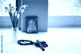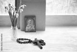 cross, rosary beads, flowers, orthodox icon and bible books. concept of faith, God, orthodox Church Holiday, lent. soft focus