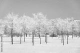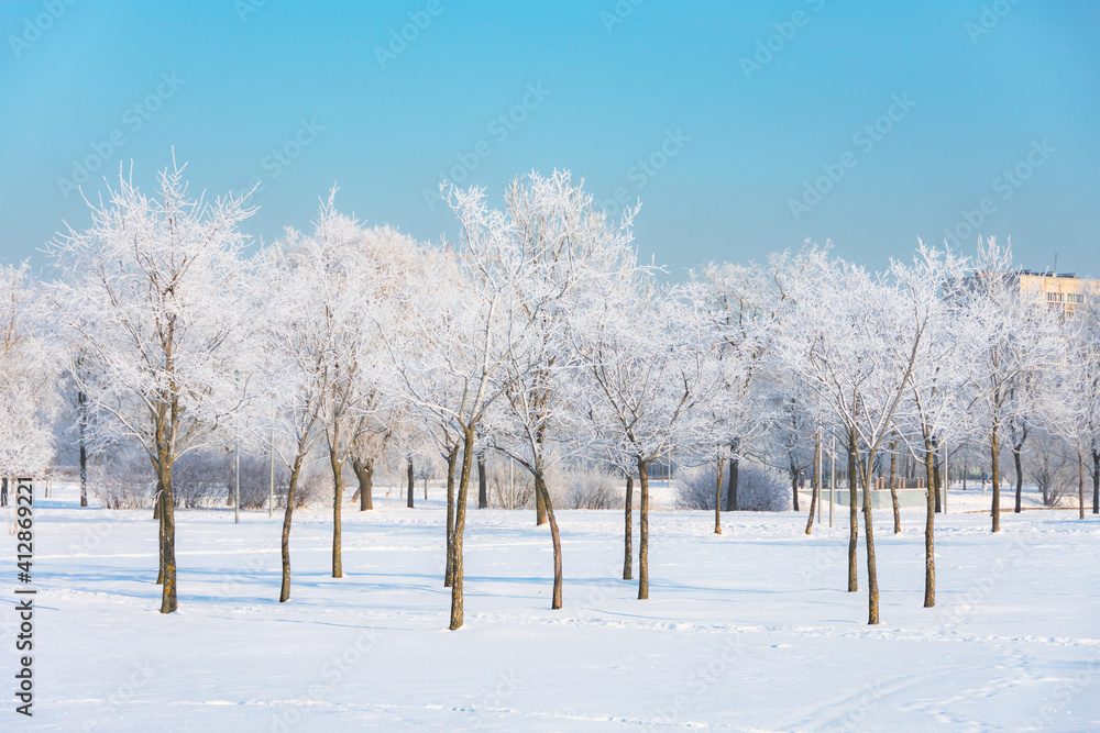 Young elm and linden trees covered in hoarfrost in a city park and the bright sun in the sky, after a night cold fog.