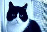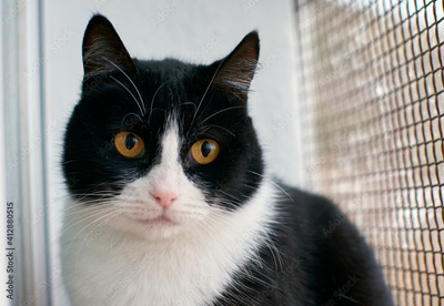 Selective focus shot of a black and white cat with yellow eyes