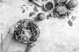 Girls' hands holding vegan, detox Buddha bowl with avocado, persimmon, blood orange, nuts, spinach, arugula and pomegranate on a light background, top view
