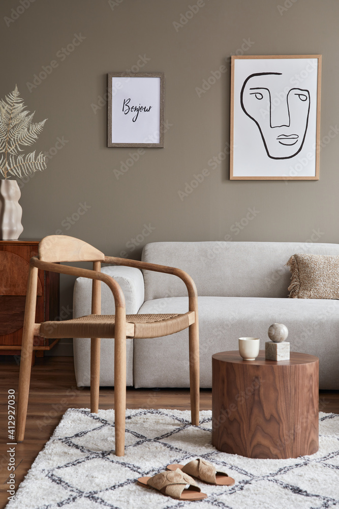 Modern composition in stylish living room interior with design chair, neutral sofa, coffee table, mock up poster frames, carpet, decoration and elegant personal accessories in home decor. Template.