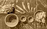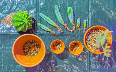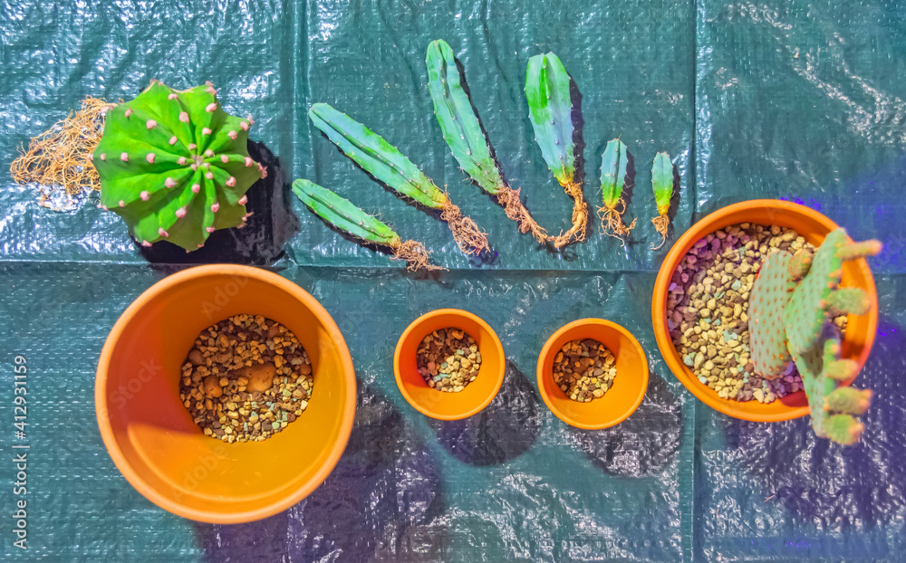 Several open rooted cacti ready to be transplanted into new soil and clay pots.