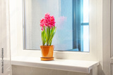 Three pink purple blooming hyacinths in one pot on the window sill in the apartment. International women's day gift.