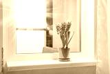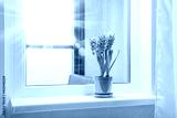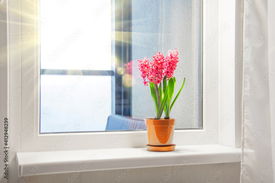 Three pink purple blooming hyacinths in one pot on the windowsill in the apartment. International women's day gift.