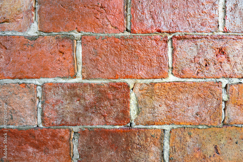 Red brick wall or clay stone wall with glaze coating surface during natural lighting reflect on it. Background and Texture of building photo.