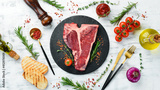 Raw T-bone steak with spices and herbs on a white wooden background. Flat lay. Top view.