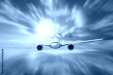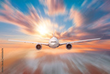 Aircraft flies motion effect high in the sky over the clouds dawn, traveling in the celestial expanse.