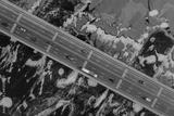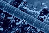 A beautiful winter view from a drone to the winter bridge with tarnosmotorm. Ice covered river