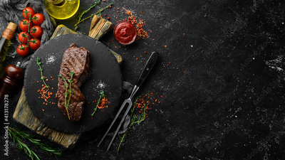 Beef Sirloin steak. Juicy cooked steak with rosemary and spices. Top view. Rustic style. Flat Lay.