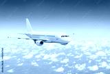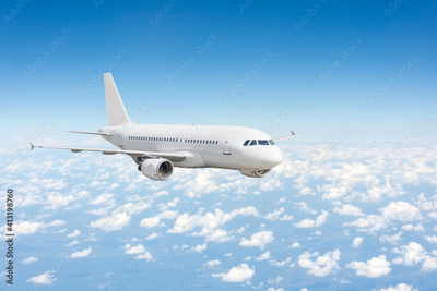 Airplane fly over the clouds and the earths surface under the blue sky.