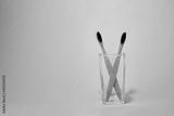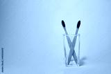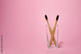 Eco friendly toothbrushes, zero waste concept. Natural bamboo toothbrush in glass jar on pink color background.