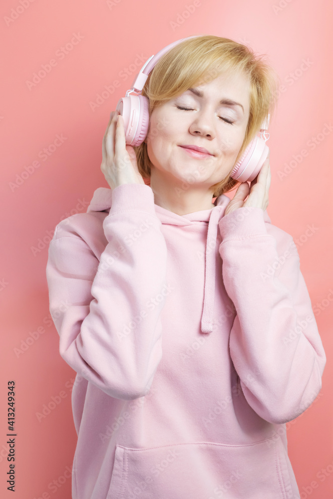 Caucasian girl in a pink sweatshirt and with pink headphones on a background similar in tone. Concept for music, podcasts, audiobooks. World Music Day, World Rock-n-roll Day.