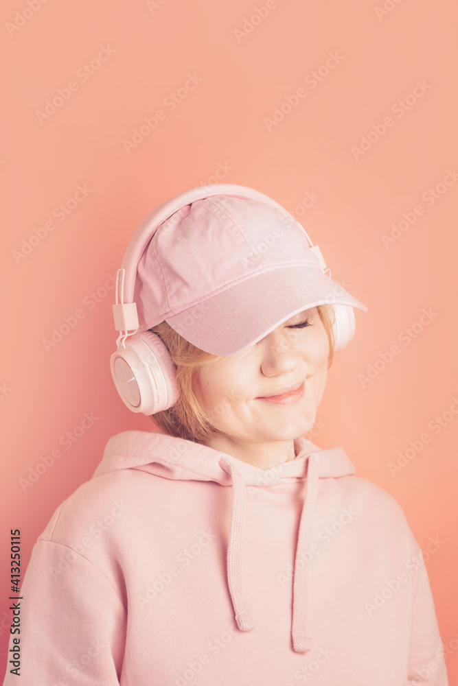 Caucasian girl in a pink sweatshirt and with pink headphones on a background similar in tone. Concept for music, podcasts, audiobooks. World Music Day, World Rock-n-roll Day.