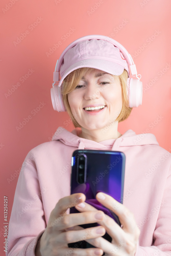Caucasian girl in a pink sweatshirt and with pink headphones on a background similar in tone. Concept for music, podcasts, audiobooks. World Music Day, World Rock-n-roll Day.