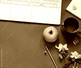 Work space flat lay with a laptop, a cup of tea and flowers on the grey background. Top view office frame composition. Copy space