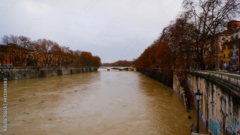 Rome, Italy Tiber river high tide water rise. Day view of high water level flooding the banks of the river crossing the Italian capital, after heavy rain.