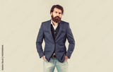 Man in suit. Male beard and mustache. Sexy male, brutal macho, hipster. Hand in with wrist watch in a business suit. Elegant handsome man in suit. Handsome bearded businessman in classic suits