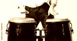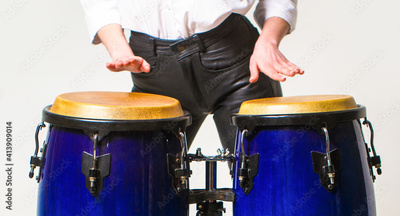 Close up of musician hand playing bongos drums. Afro-Cuba, rum, drummer, fingers, hand, hit. Drum. Hands of a musician playing on bongs. Performers playing bongo drums