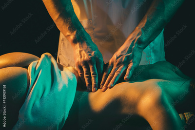Masseur doing massages on woman body. Herapy, body care, massaging, aromatherapy. Spa body, woman massage, girl massage, massaging. Beauty treatment concept