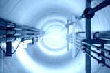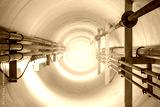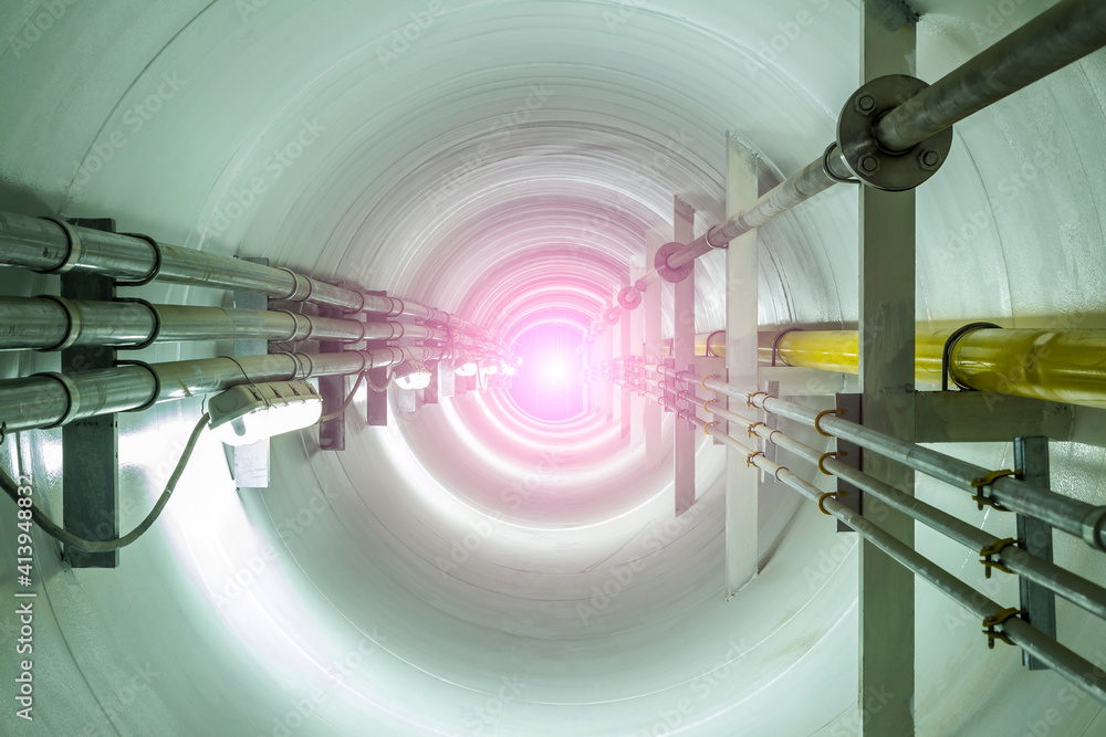 Confined space inside underground tunnel. Construction from engineering technology for infrastructure i.e. power line or cable, steel pipe in perspective view. To transport water, gas and electricity.