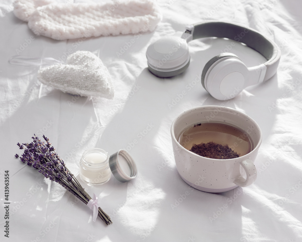 Flat lay with healthy herbal lavender tea in cup for relaxation before bedtime. Sleep mask and balsam with essential oil