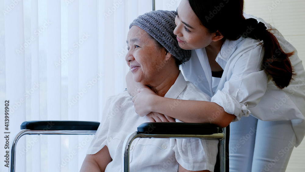 daughter encourages and comforts a mother with cancer during hospitalization.