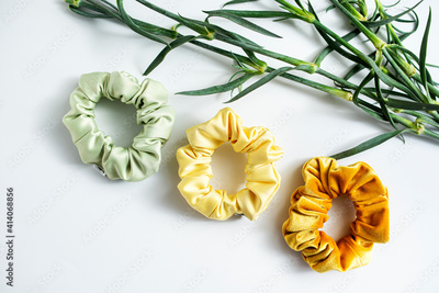Cute colorful hair ornaments, rubber bands on a white background with green leaf decoration