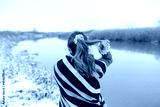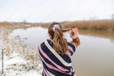 a girl in a hipster blanket on a snowy day, wearing a pink ornament in her hair