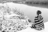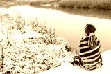 the girl with her back turned looks towards the river and wears a hair ornament in her hair